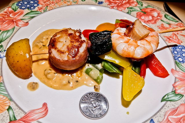 這串東西也太華麗了一點, 培根搭配烤過的新鮮干貝, 加上鮮蝦配杏鮑菇