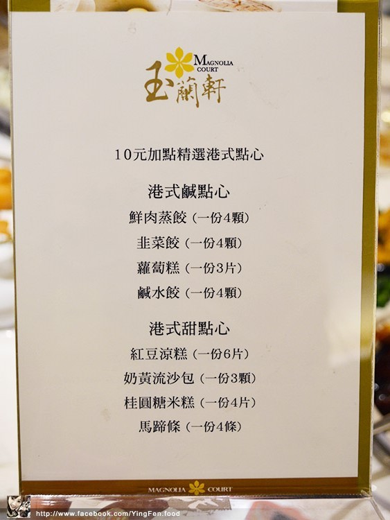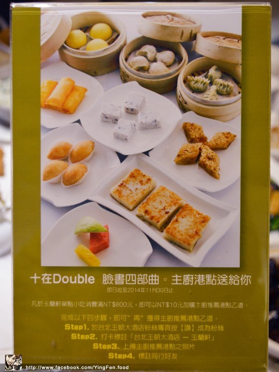 即日起至2014年11月30日止,玉蘭軒單點小吃消費滿NT$800元,即可NT$10元加購主廚推薦港點乙道。