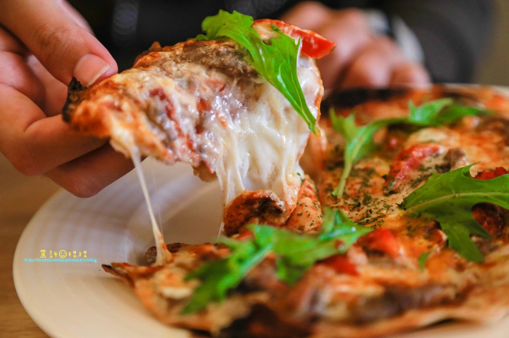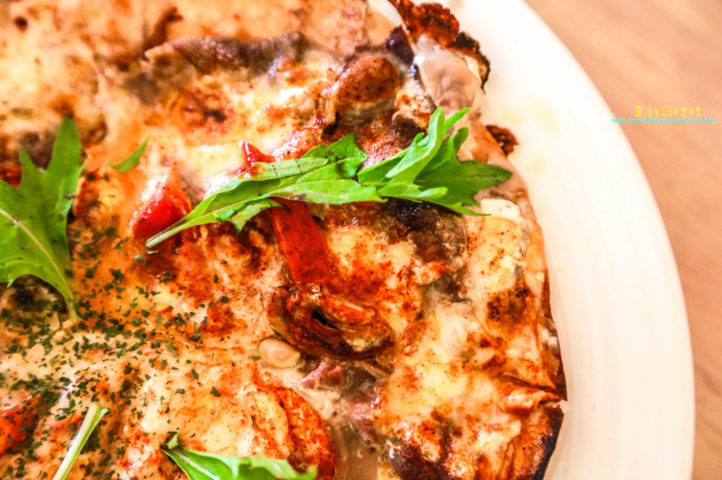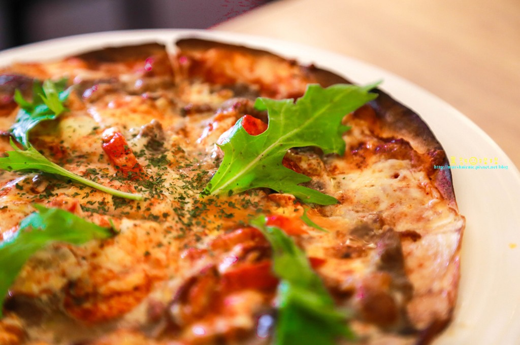 而其中的食材包含番茄、牛肉、蘑菇…等,牛肉非常的軟嫩,所以和pizza搭配一起吃非常順口,不會有咬不爛的感覺,