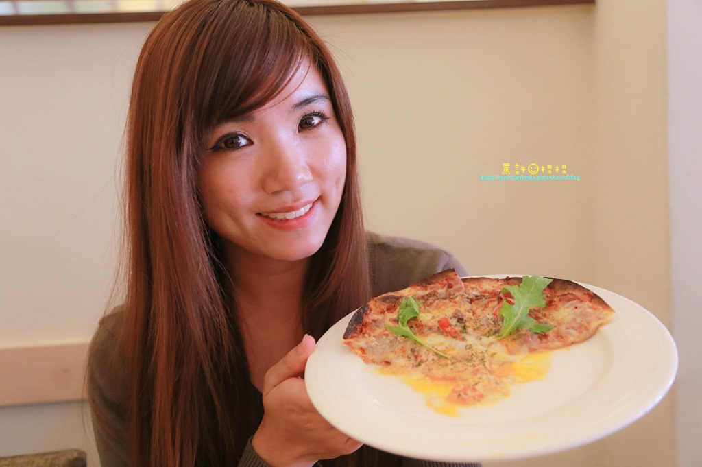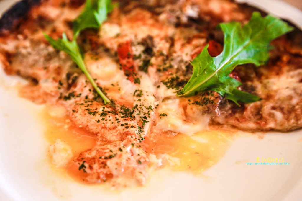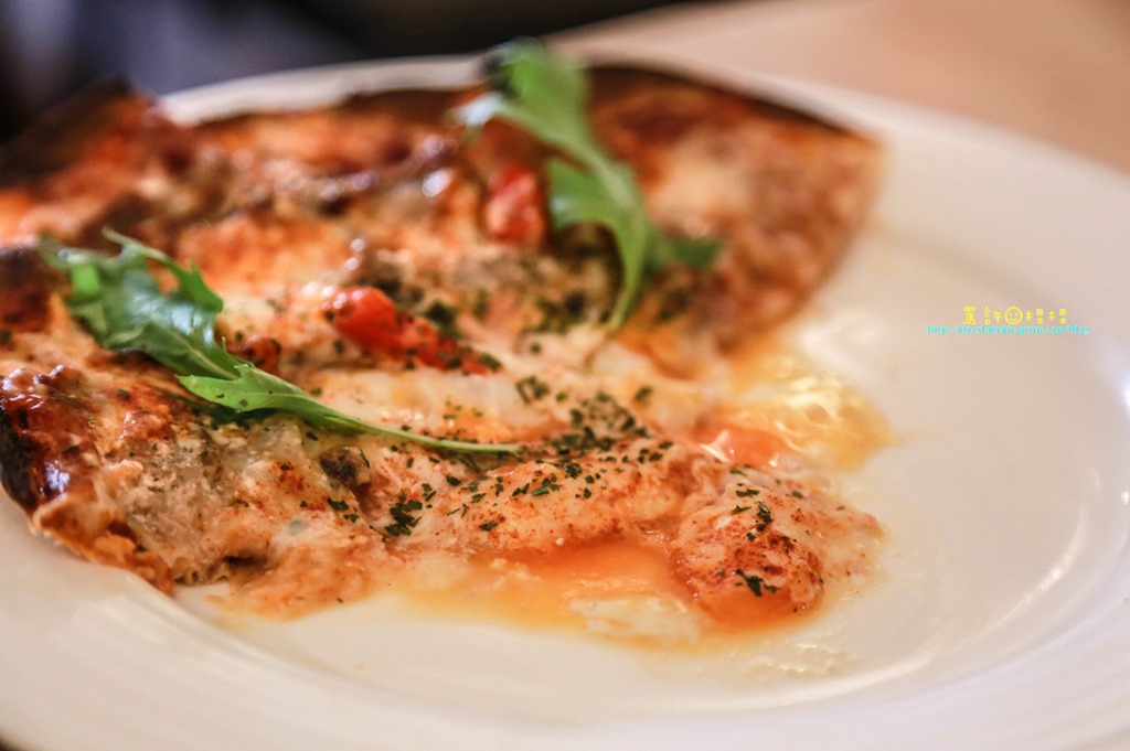 沒錯,有一顆非常嫩的蛋在pizza下方的正中央,半熟的蛋黃及蛋白汁液吸附在餅皮上,