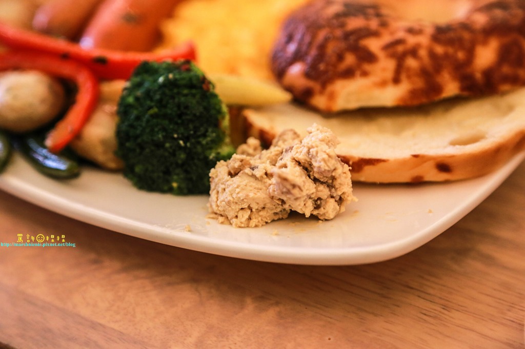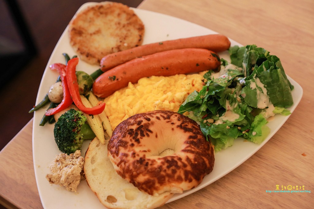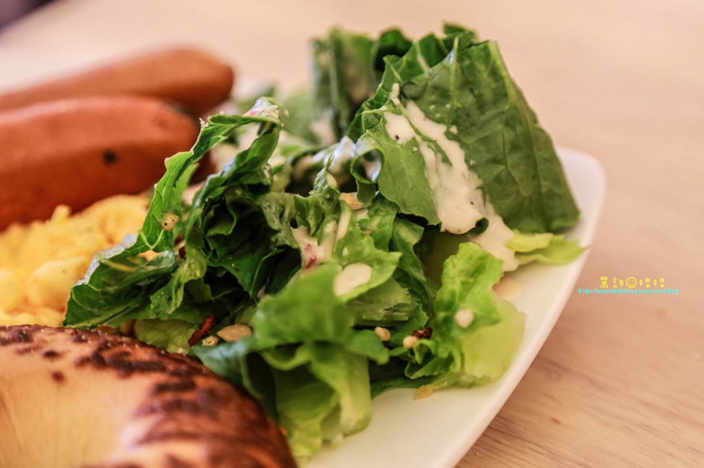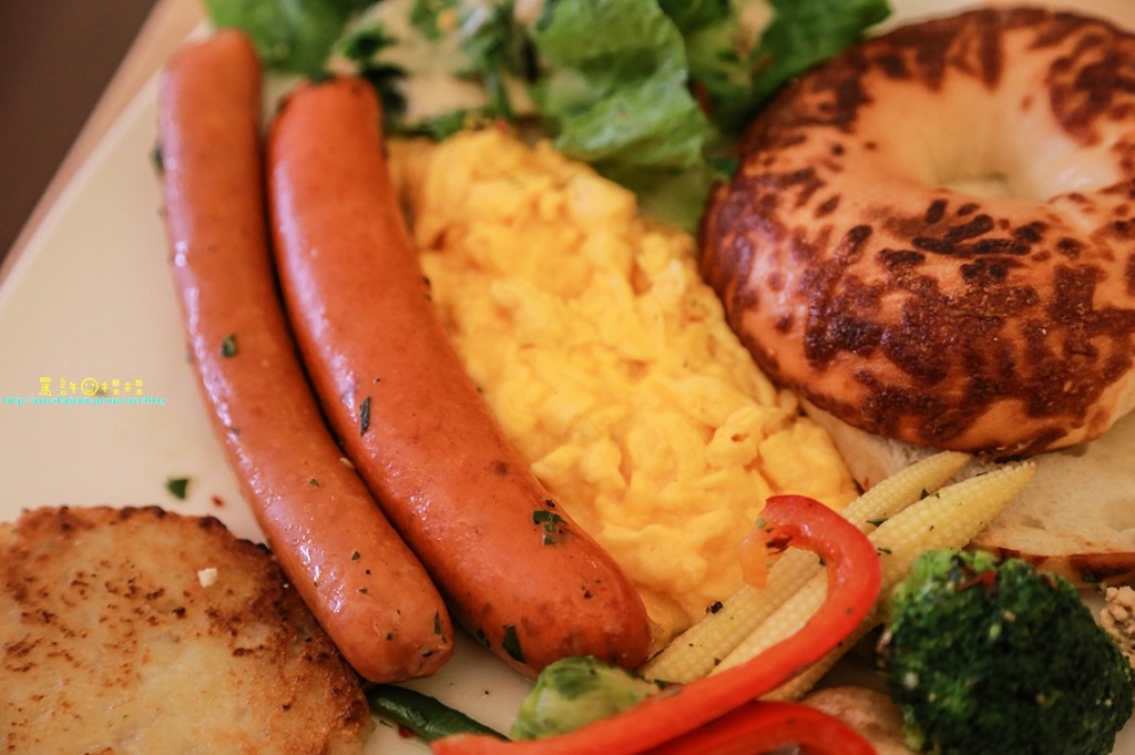 內容有貝果、巴伐利亞脆腸、德國勳香腸、薯餅、炒蛋、沙拉、炒蔬菜、堅果乳酪…等,
