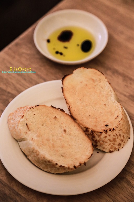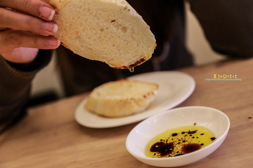 而麵包有別於上面較紹的焙果口感,這裡的麵包比較酥脆,但又不會過硬,一旁有油醋可沾著,