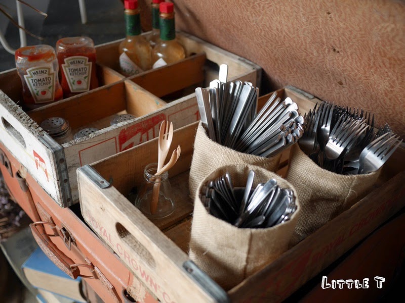 店內的餐具、水和調味料都是採自助式的唷! 連餐具的容器都是用麻布做成的,質感加分!
