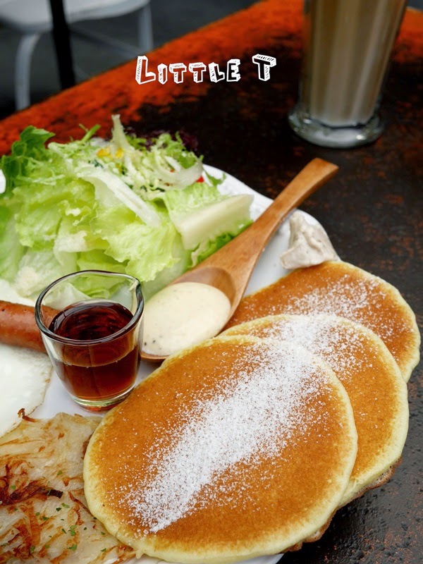 三大片撒了白糖霜的扎實鬆餅配上楓糖漿和核桃乳酪,光是這三種組合就口水直流了XD