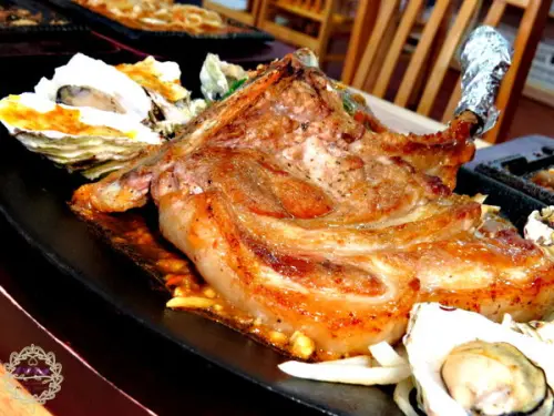 德國豬腳烤的皮QQ,不油不膩不焦,沾上店家附上的三元件