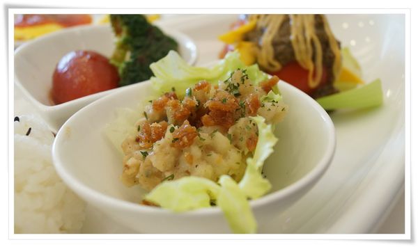 簡餐中的小菜,看起來就很費工,當天吃到很像蝦鬆但是不是蝦鬆!大顆梅漬番茄,義士香料醬佐番茄起司