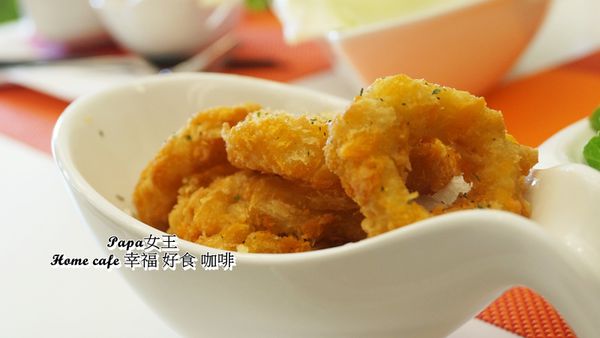 配菜二~ 外表像蝦鬆 但是他不是蝦鬆,蒜香味超濃!濃到我只吃出來蒜味,口感脆脆的 帶著奶醬調味