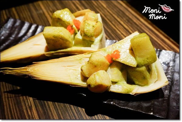 用菠菜醬汁淋上烤過的綠竹筍,裡面的竹筍水分充足,且搭配點蝦卵點綴,味道相當清爽。