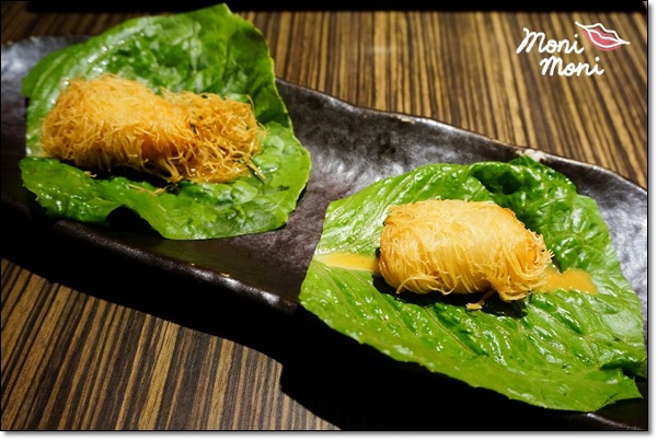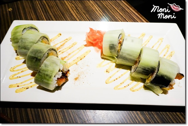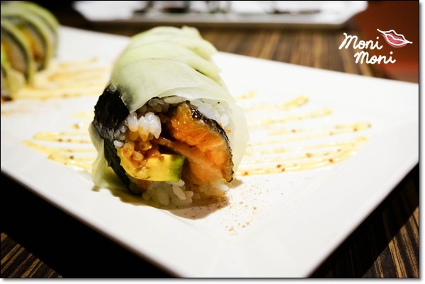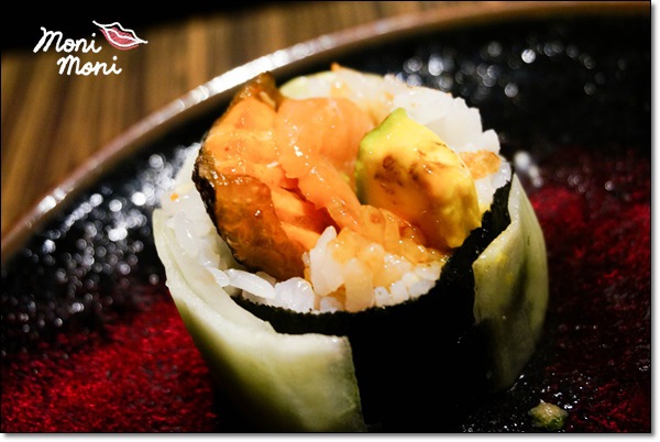 運用生大黃瓜刨成的大薄片捲起燻鮭魚並將鮭魚皮烤至酥脆,裡面包裹醃漬過的蘿蔔、新鮮酪梨和蝦卵,用料相當豐富。