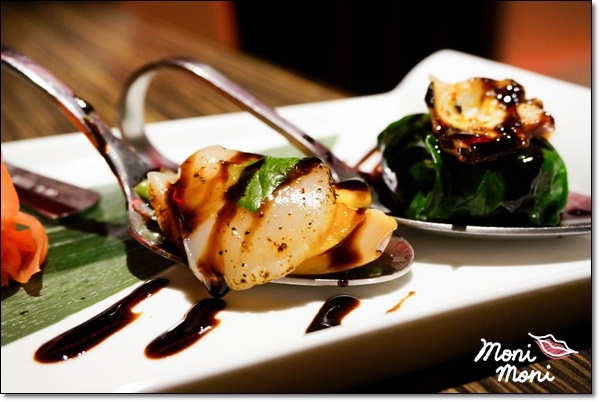 依照口味的清淡濃烈來決定吃的順序,先從口味較清爽鮮甜的輕炙醣心干貝開始吃,因為淋上了紅酒醋味道較獨特,而菠菜球則是包覆著冰涼的龍蝦沙拉,創新的方式,讓客人吃了也覺得新鮮新奇美味。