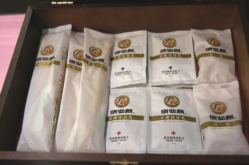 浴室的備品放在木盒子裡,