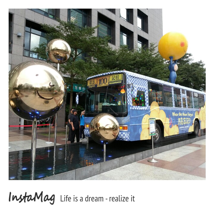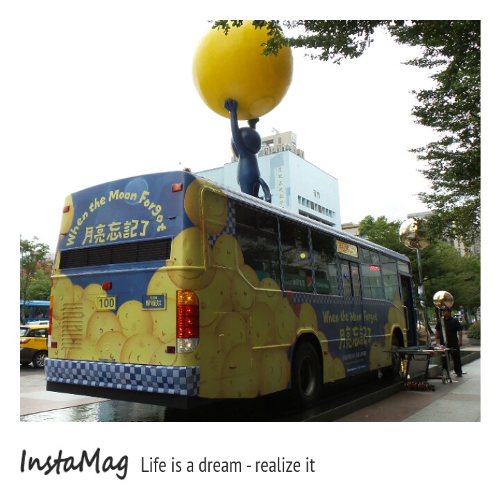 幾米月亮公車站牌,100 Moon Bus,駕駛是繪本家幾米原著廖福彬,站名是信義房屋站,從這裡出發,起點是遺忘Forgotten,終點站是記住Remembered