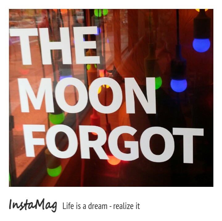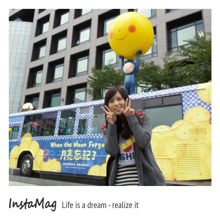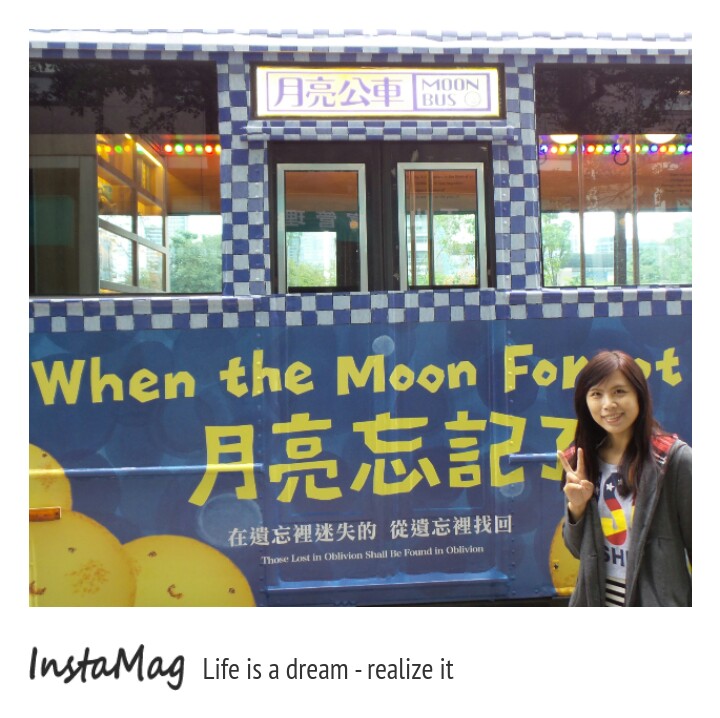 公車以藍白色的馬克做框線,還有大大的標語When the Moon Forgot月亮忘記了,在遺忘裡迷失的 從遺忘裡找回