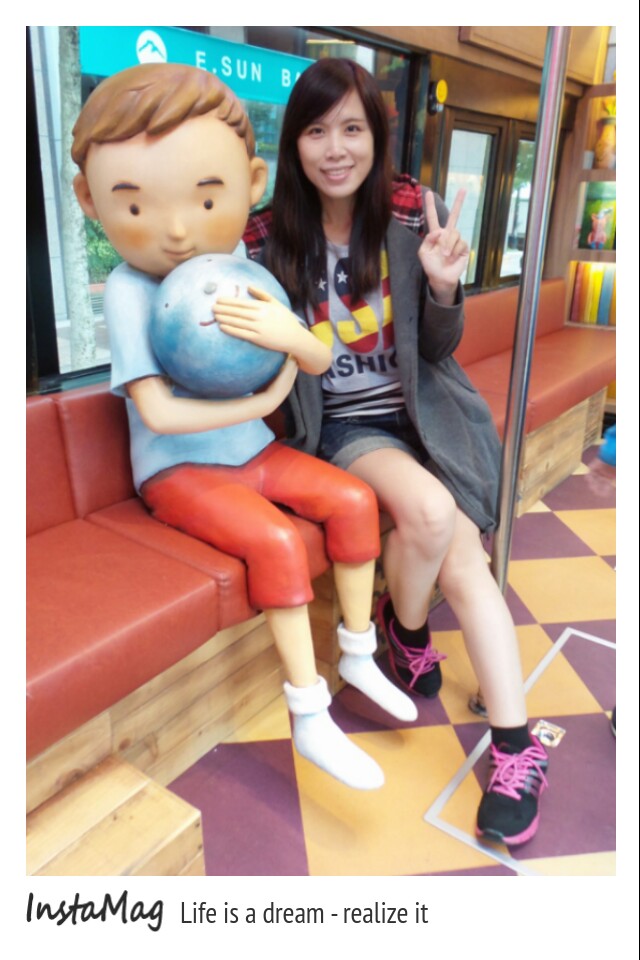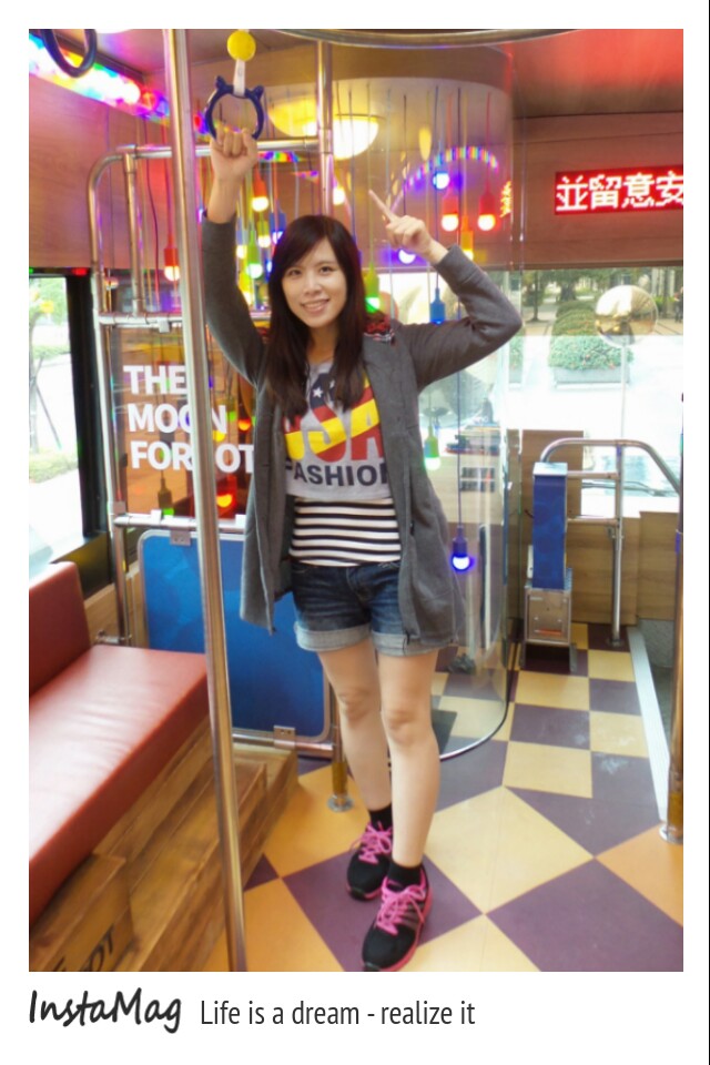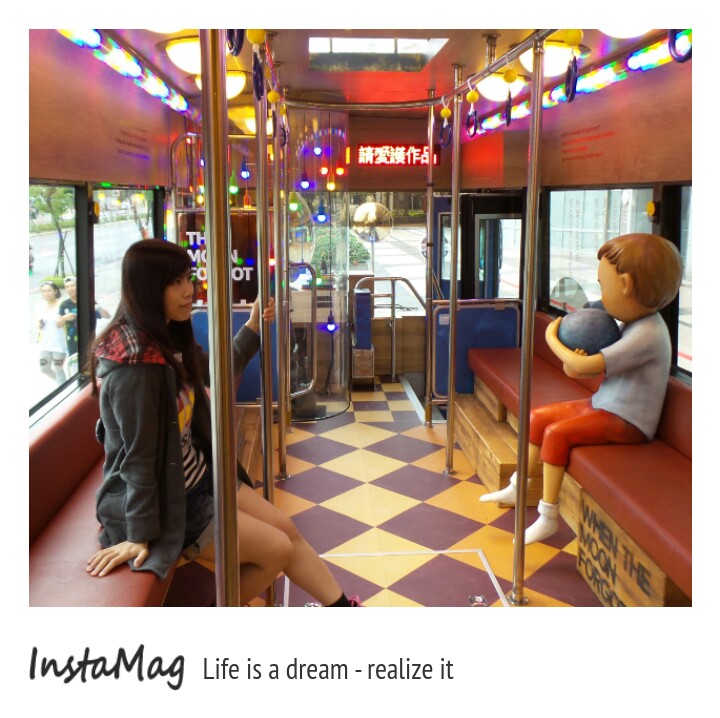 幾米化身為一隻熊熊,是我們今天的司機大哥,在他前面擺放了一些相關的書籍還有公仔,週遭的燈飾五顏六色,好漂亮喔,投幣箱裡有好多個月亮,投幣之後,還會有聲音會回應你喔