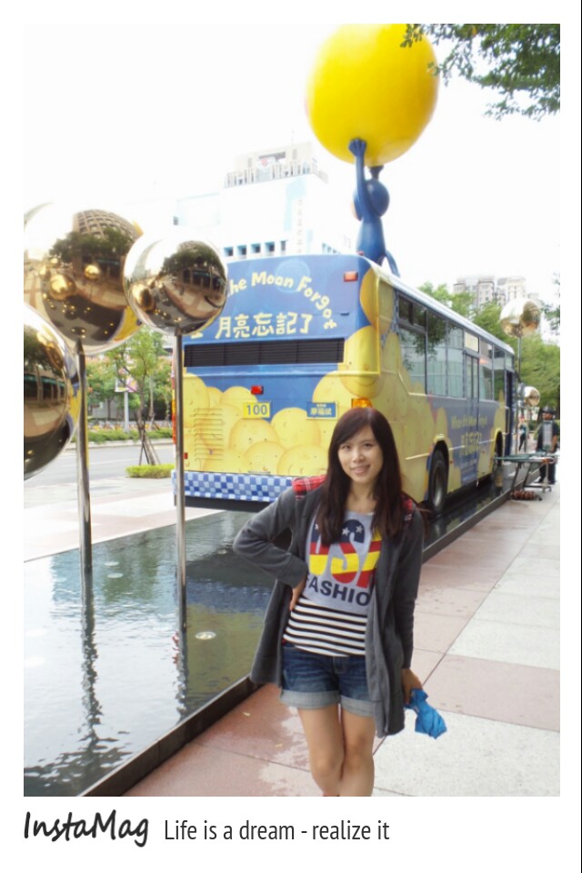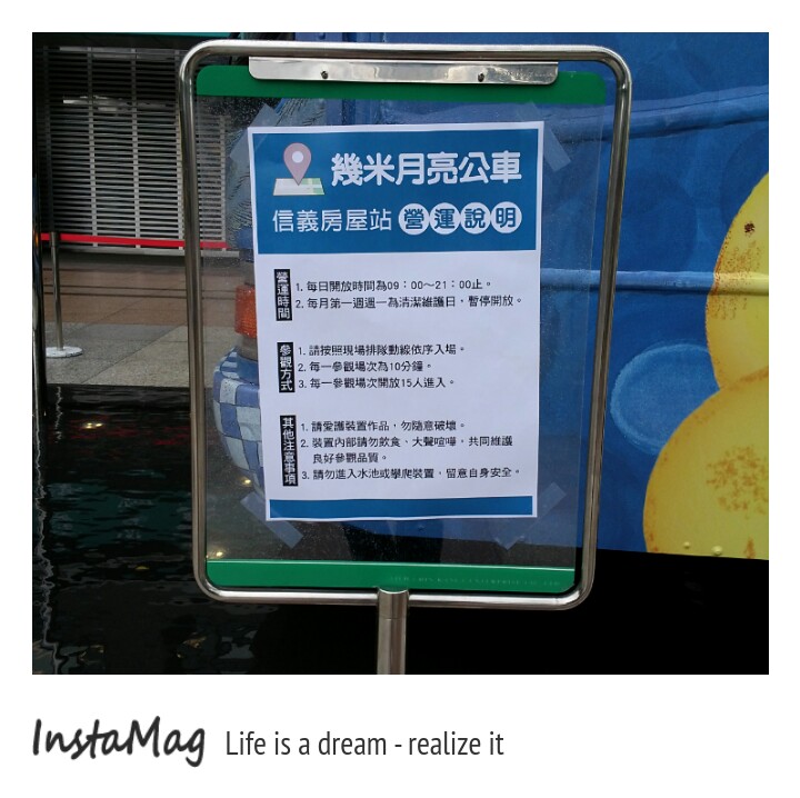 坐捷運紅線到台北101/世貿的5號出口走出來後,尋找左手邊馬路斜對面的信義房屋總部,大樓的一樓有玉山銀行,門牌號碼100,今天的亮麗主角幾米月亮公車就在這個位置從繪本裡跳脫到現實世界裡喔