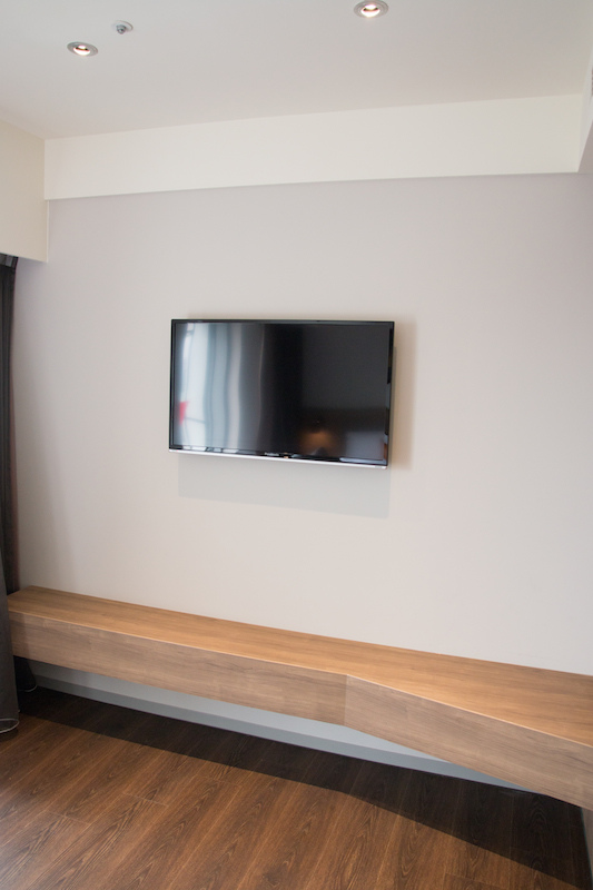 新裝修的房間果然是相當地新,地板採用木面地磚,踩起來感覺挺舒適的。雖然空間不算大,但還是塞入了一張大床以及兩張組合起來的單人沙發,沙發放在床腳,面對著電視,設計成可躺在床上也可以坐在沙發看電視的格局。