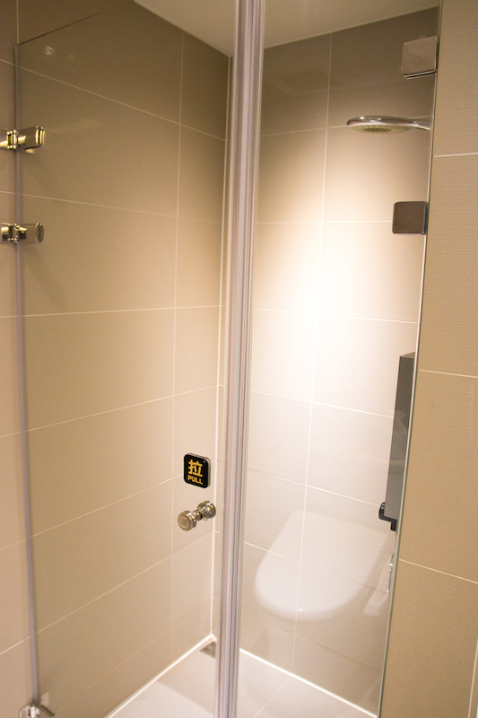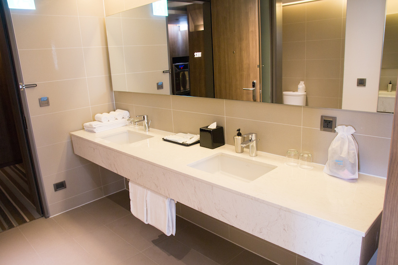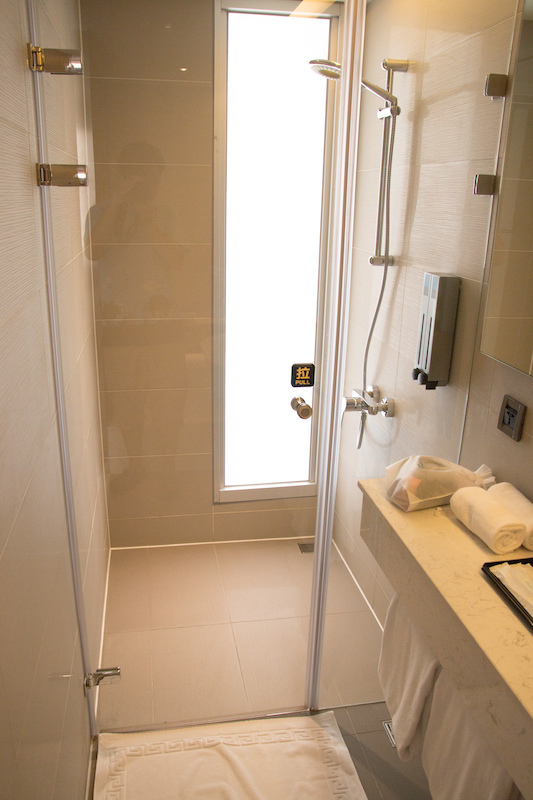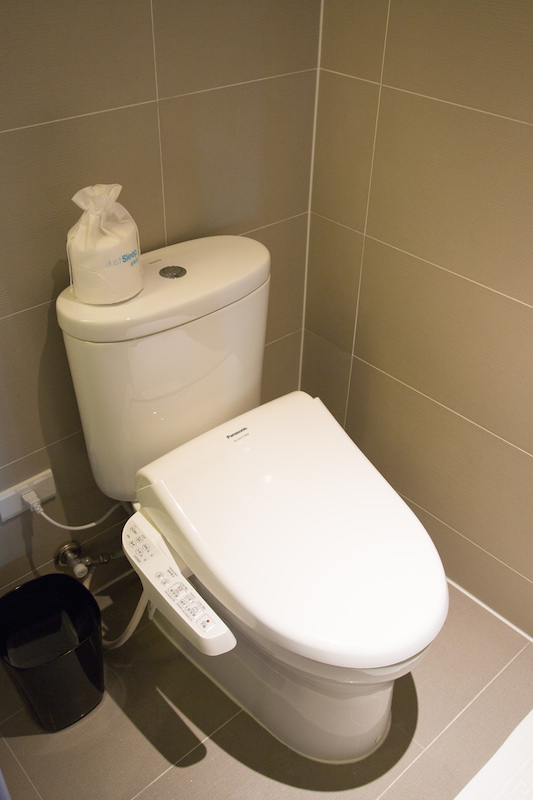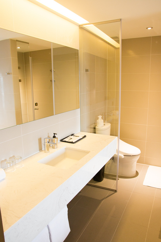 浴室的空間不小,設有一組洗手臺以及浴缸,浴缸的空間與臥室之間隔著透明玻璃,有窗簾可以阻隔起來。另外也設有封閉的乾濕分離淋浴間,而個人覺得最超值的大概還是設置了免治馬桶,一般的商旅大概是不會有免治馬桶的設置,以兩千多塊的房價而言,真是挺不錯的。