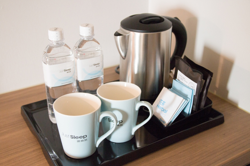 今天入住雙人房,一進門的玄關右手邊就是桌子、冰箱以及附贈的茶水飲料。捷絲旅對旅客蠻貼心的,還贈送玩樂護照以及手繪的夜市地圖,去護照裡的店家消費可以打折,手繪地圖我拿到的是附近的武廟夜市還有稍遠一點的瑞豐夜市。