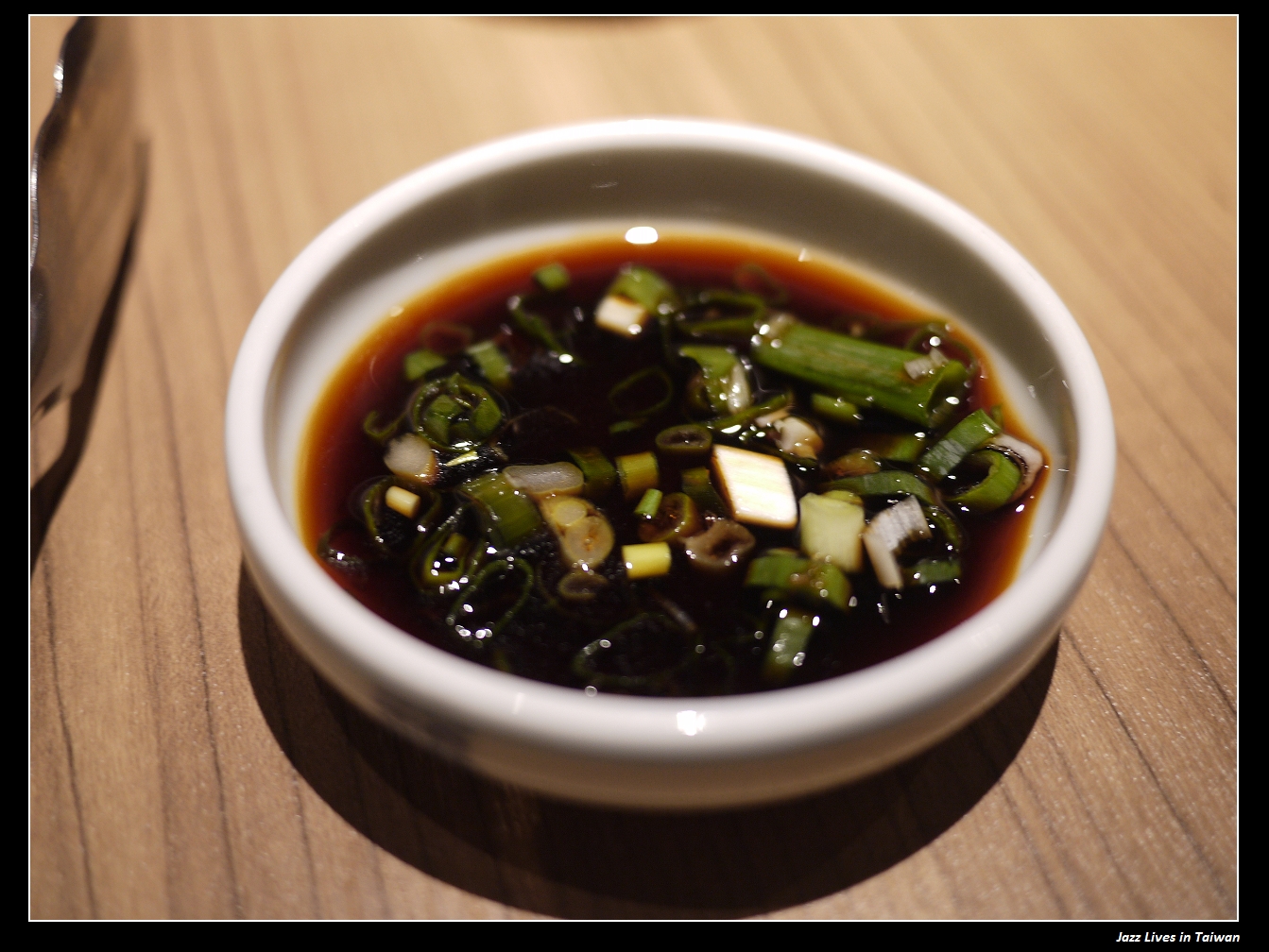 由遠至近醬料分別是: 水果醬油, 辣銅盤醬, 銅盤醬, 辣椒, 蔥花,