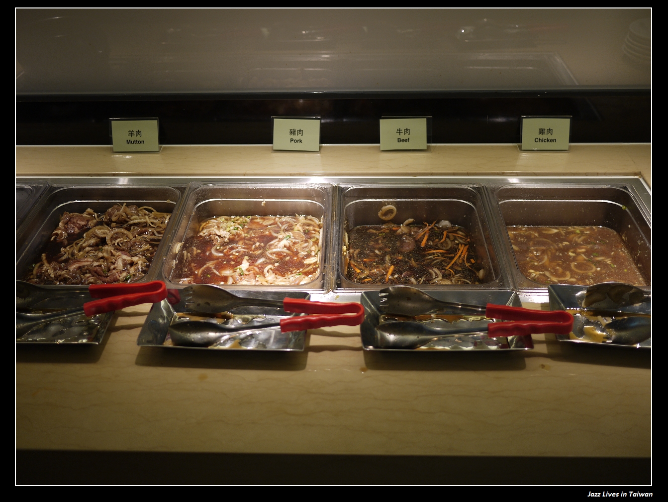 肉類自助取菜區, 很道地的韓國烤肉, 雖然只有雞肉, 牛肉, 豬肉, 羊肉四種選擇, 不過肉類都有事前醃過, 真的很有韓國烤肉的風格,