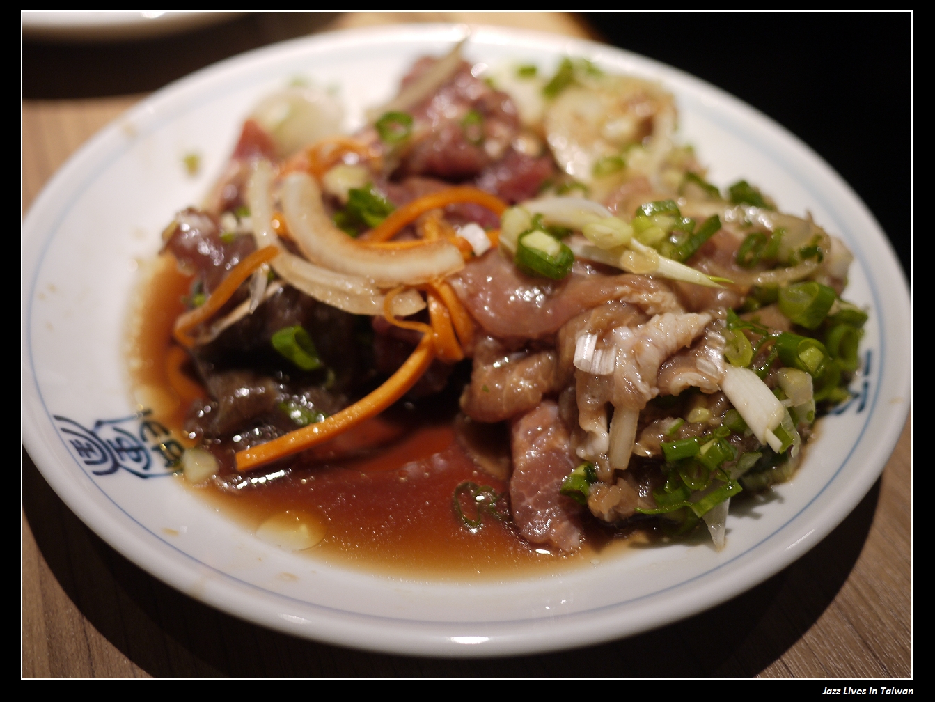 夾回桌上的肉盤示意照, 看得出來用了很多洋蔥, 蔥花, 紅蘿蔔等蔬菜醃製,
