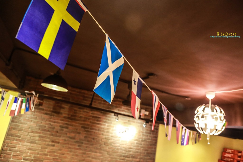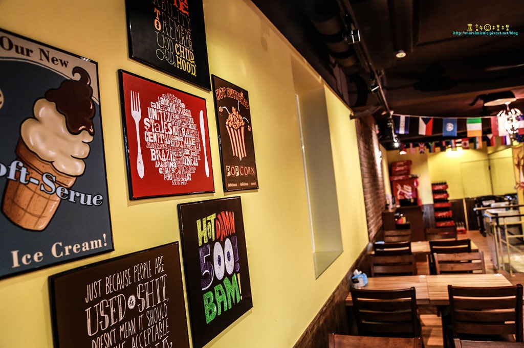 店內裝潢很簡單舒適,牆上有著些許彩繪,屋頂上吊著國旗,整個就是美式餐廳的fu,