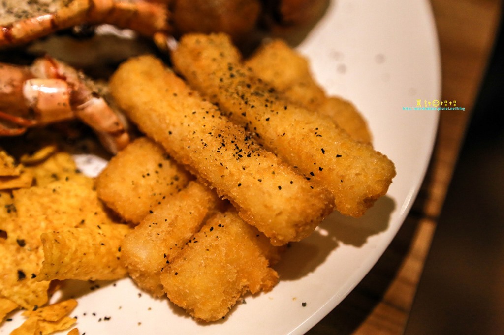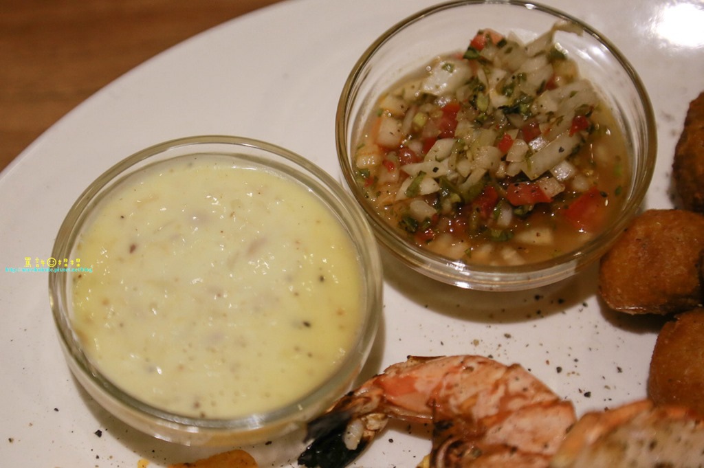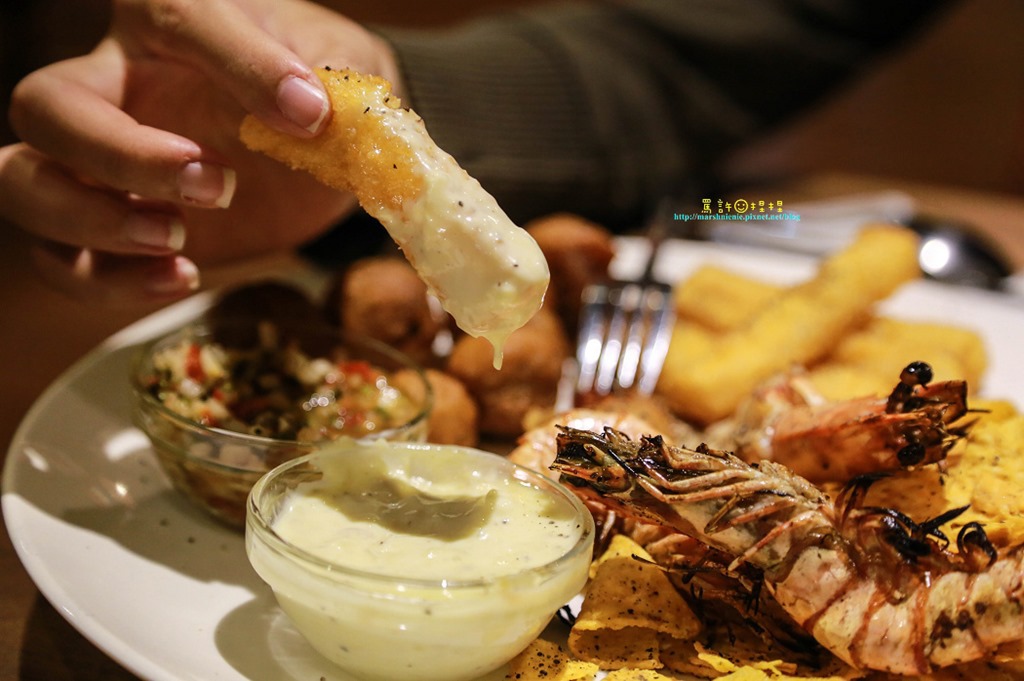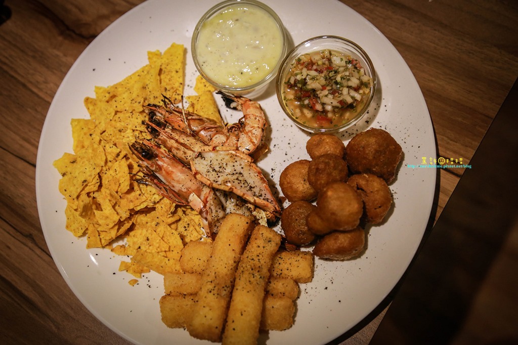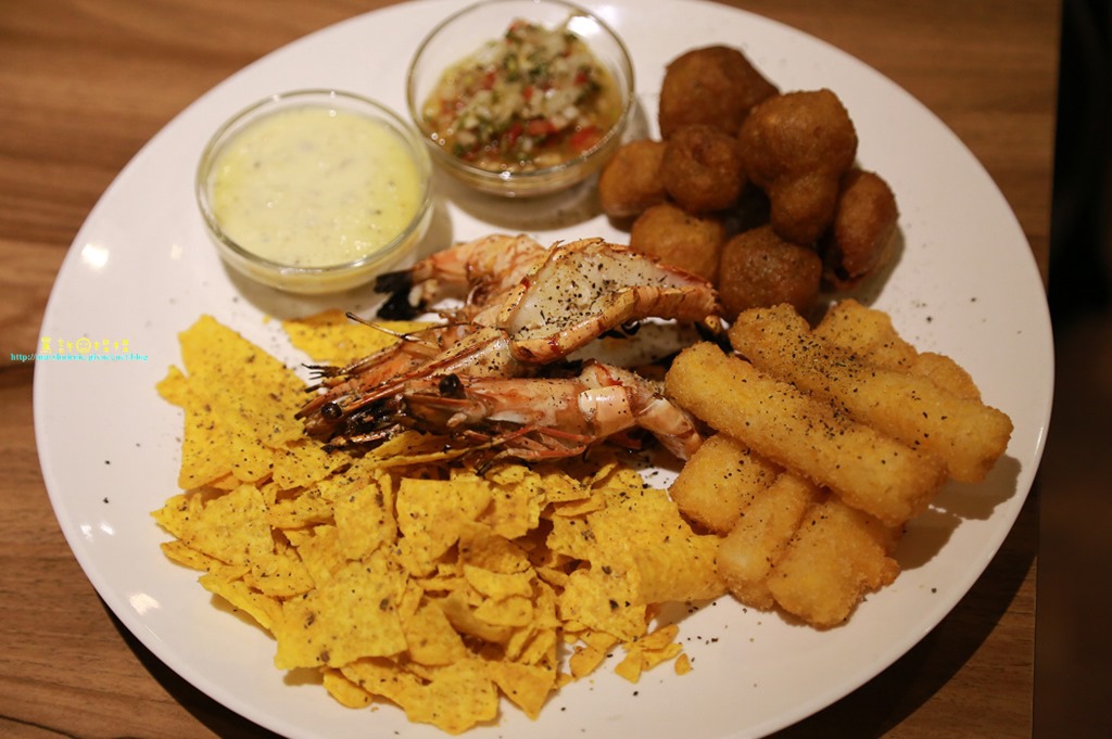 裡面的炸物真的很豐富,有烤蝦*3、鱈魚條*5、蘑菇球*8、玉米片…等,醬是提供莎莎醬和鮪魚沙拉醬,