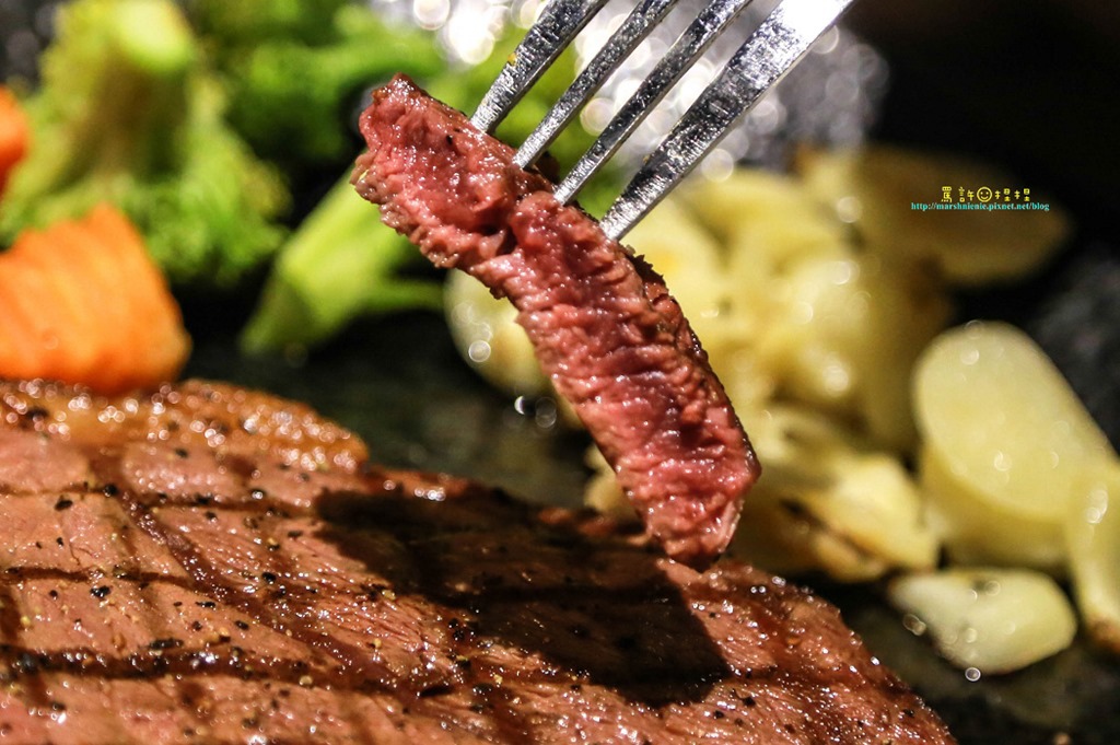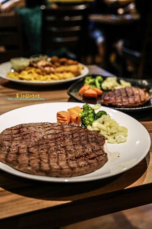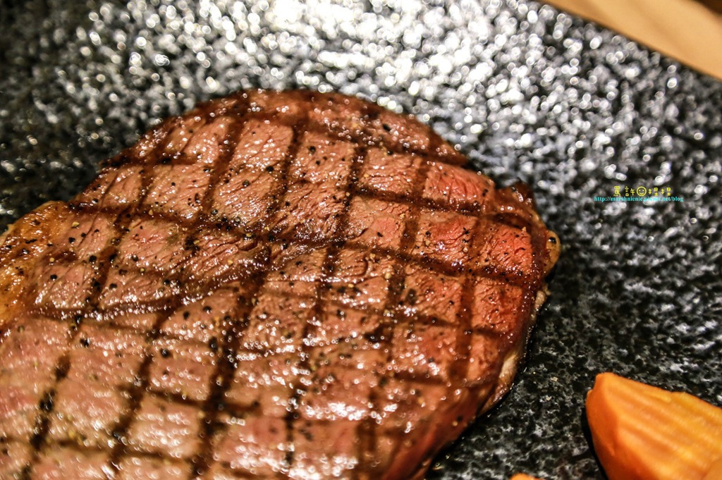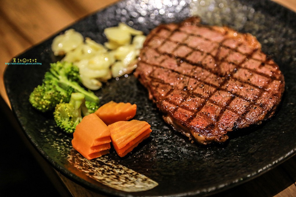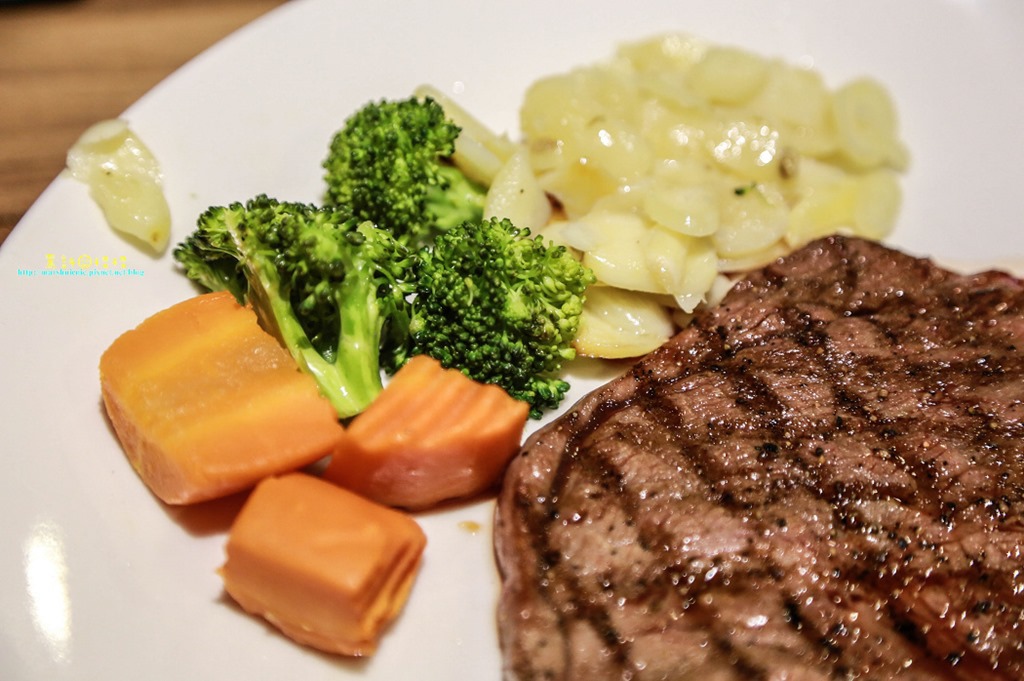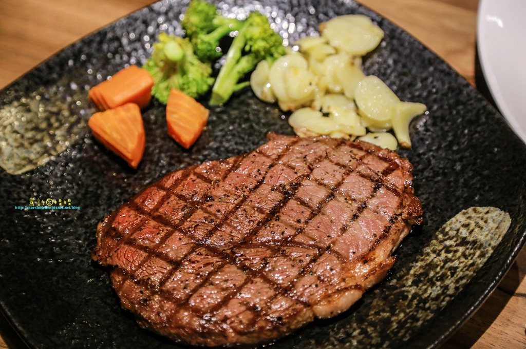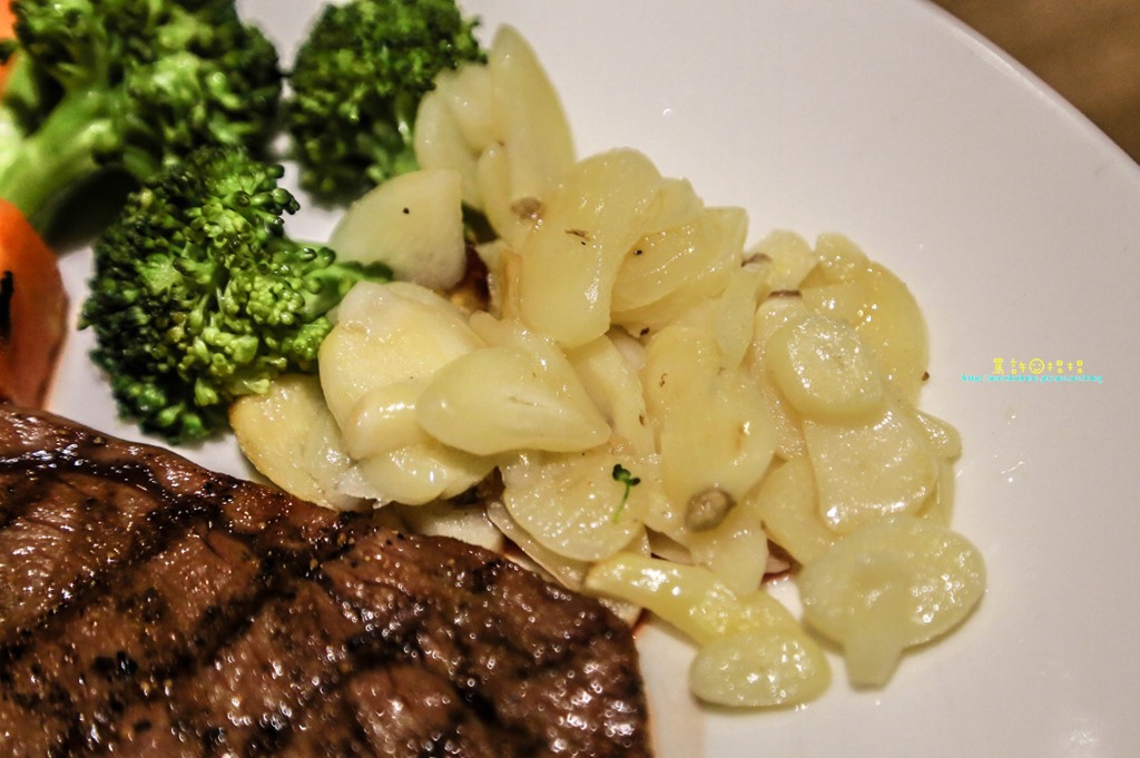 它的牛排上方有格子痕跡,而我們選擇5分熟帶有一些些的血水,但不會多到很可怕,只有微量而已,5分熟吃起來還算熟的,