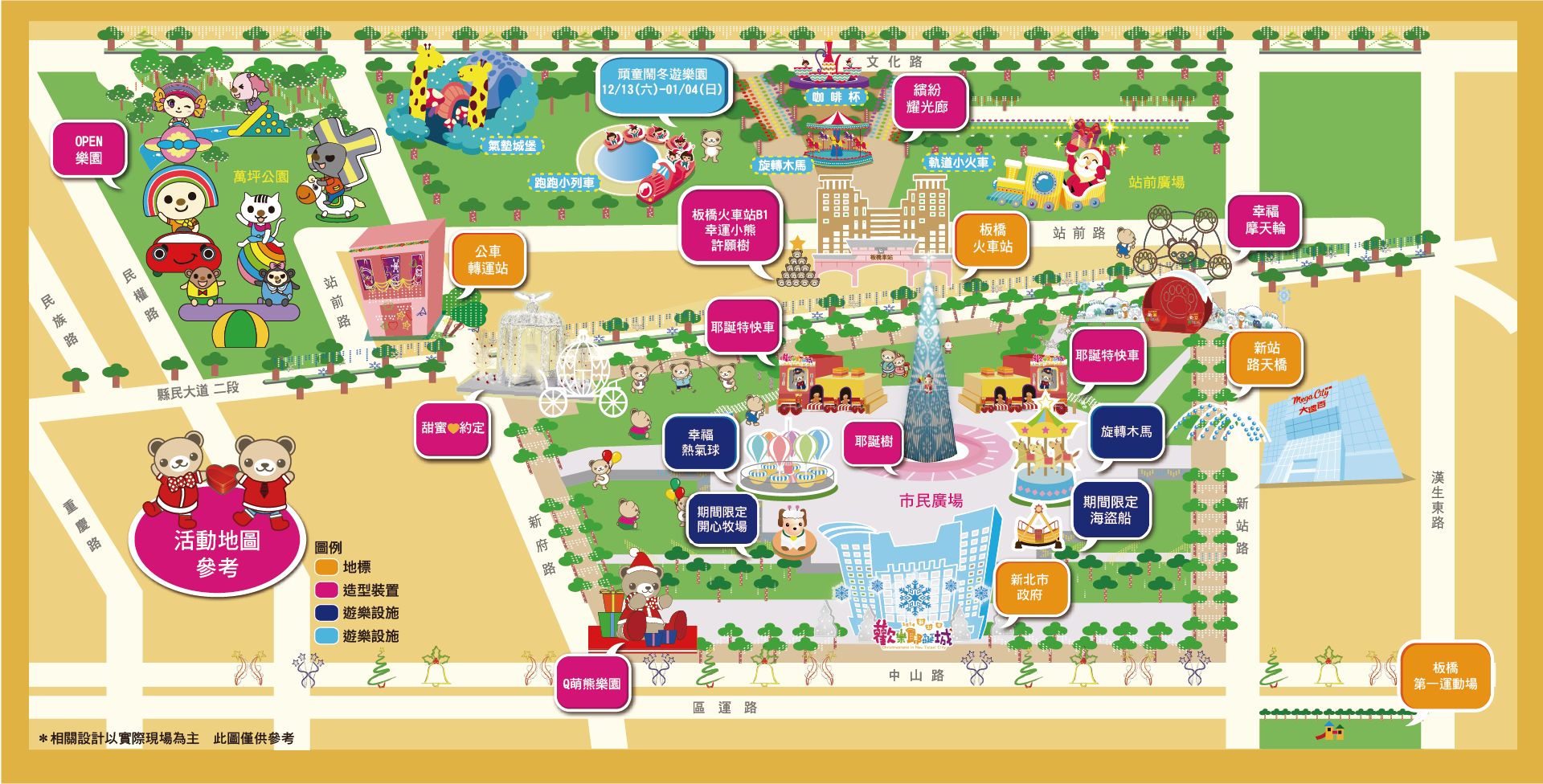 2014新北市歡樂耶誕城地圖,取自活動官網,大家可搭配這活動地圖與下列的燈飾照片,實際造訪時會更加有印象與方便。搭乘捷運至板橋站2號出口或3號出站後即可到達,也可搭乘至板橋火車站、板橋高鐵站、板橋客運站。