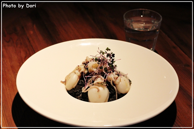 小花枝有5顆,每顆都擁有軟嫩及Q彈的質地,處裡方式很棒,而且相當好咀嚼,並不會有那種咬不斷的感覺。將小花枝與墨魚醬燉飯一併入口,墨魚與花枝的味道結合,口腹已達滿足滋味,或許就像是將牡蠣與白飯塞在口中,緩緩咀嚼的一種快樂吧。