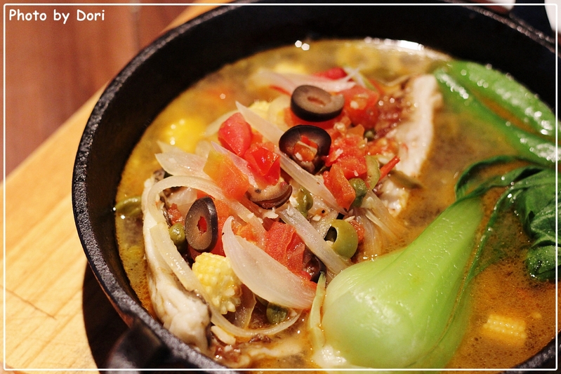 蔬菜相當多又豐富,黑橄欖、洋蔥、蕃茄、玉米筍、酸豆和墨西哥辣椒,還有一大顆的清江菜在裡頭。重點是這湯頭僅有淡淡的酸、辣、清甜味,頗有偏泰式的風味在其中,但又不是重口味的酸辣,讓人接受度很高。