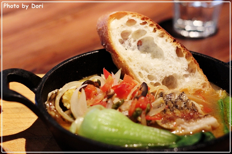 這名子太長到讓我只記得青衣魚,但也是午餐裡價格較高的一道料理,單點NT480元、套餐NT550元。盛裝青衣魚料理的是鑄鐵鍋,所以會有些重量,看著切片的法式白麵包和顏色極佳的蔬食配菜,讓人食慾大開。