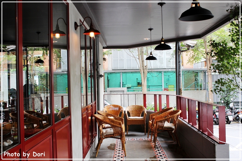 餐廳門口前有顆小楓樹,等到天氣慢慢變冷,應該就能看到紅通通的楓葉了。紅色大門在素雅的灰白色牆上相當顯眼,地面上也設多了不同地專的巧思設計,外頭的藤椅或許是提供給等待的客人一個安置的座位。