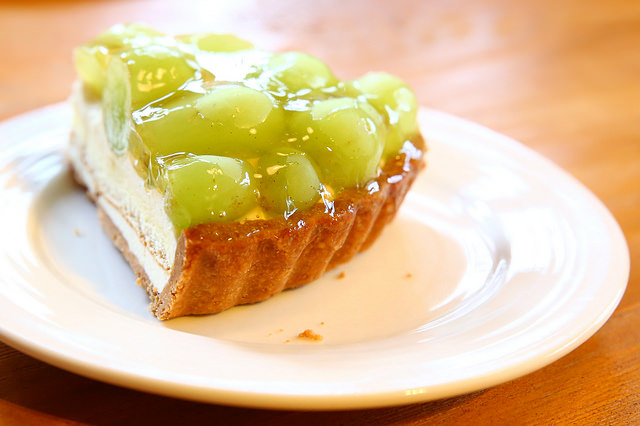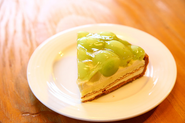 白葡萄圓舞曲看起來就很吸引人啊!無籽白葡萄就像是綠寶石一樣閃耀著光芒,中間是成熟風味的白蘭地奶油餡跟一層鬆軟的蛋糕,結合多汁的葡萄和最下層的酥爽塔皮,大叔我就直接用手拿起來,把三種不同口感一起給它咬下去,超過癮的啦!用叉子慢慢插算什麼男子漢~