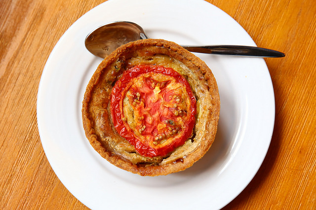 田園番茄培根鹹派來囉!上桌的時候還是熱呼呼的,裡面有~洋蔥、培根、青花菜、玉米筍、乳酪絲、番茄。尤其是番茄切片後在最上面被烤乾,形成的圖案非常可愛,整個是外酥內軟,小品姍也很愛吃呢。