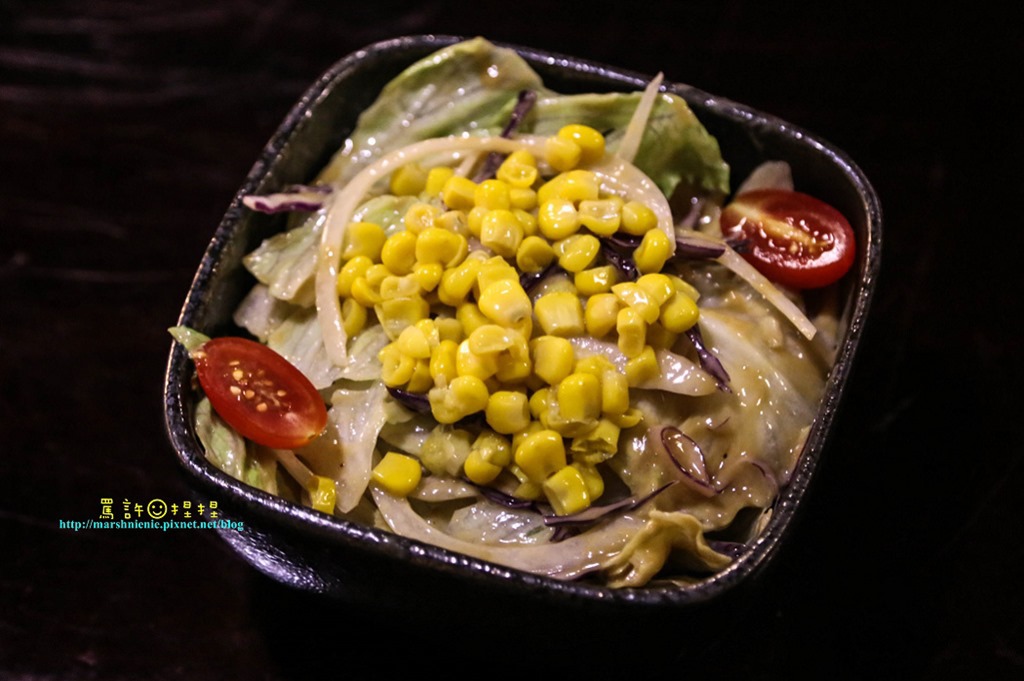 它們的沙拉內容有玉米、生菜、番茄、紫高麗菜絲…等,上方淋上超香的芝麻醬,
