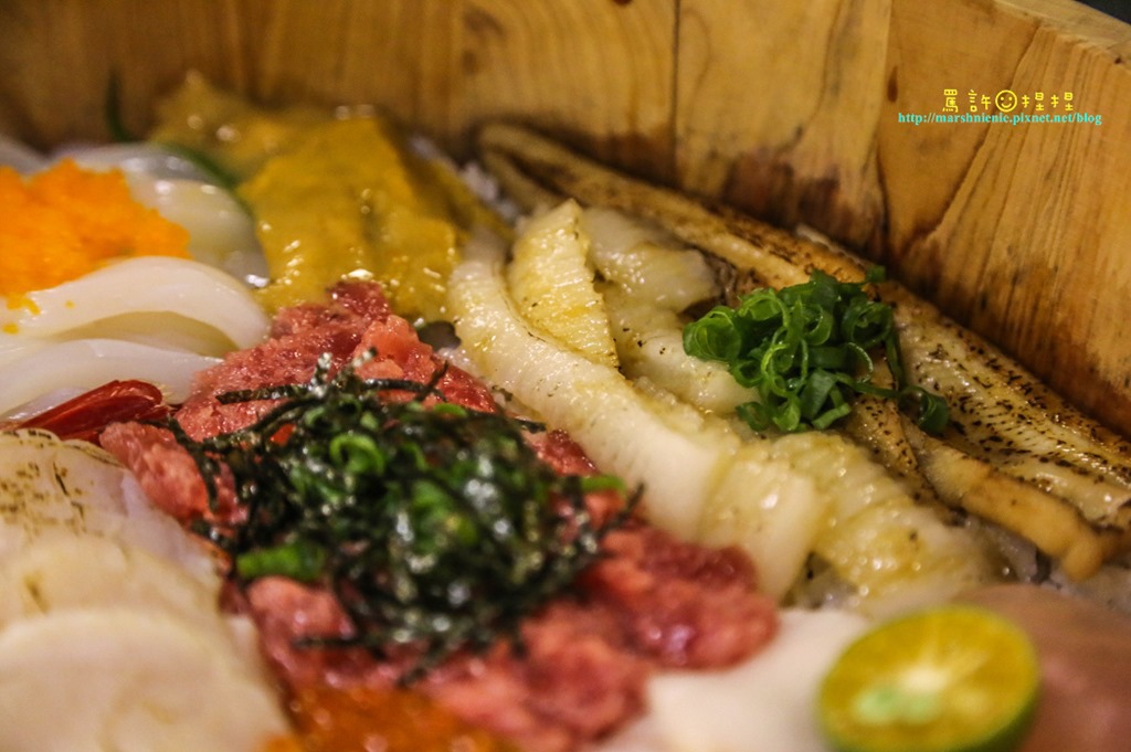 下面則是鋪著薄薄的一層醋飯,大家可以將生魚片搭配醋飯一起食用,就像壽司的概念,