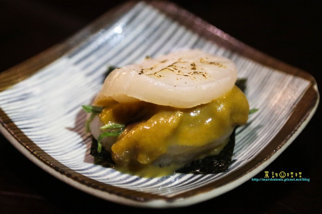 在看到這道料理前,我們一直覺得它是使用漢堡皮,然後把干貝和海膽用特殊的料理方式夾在漢堡皮中,