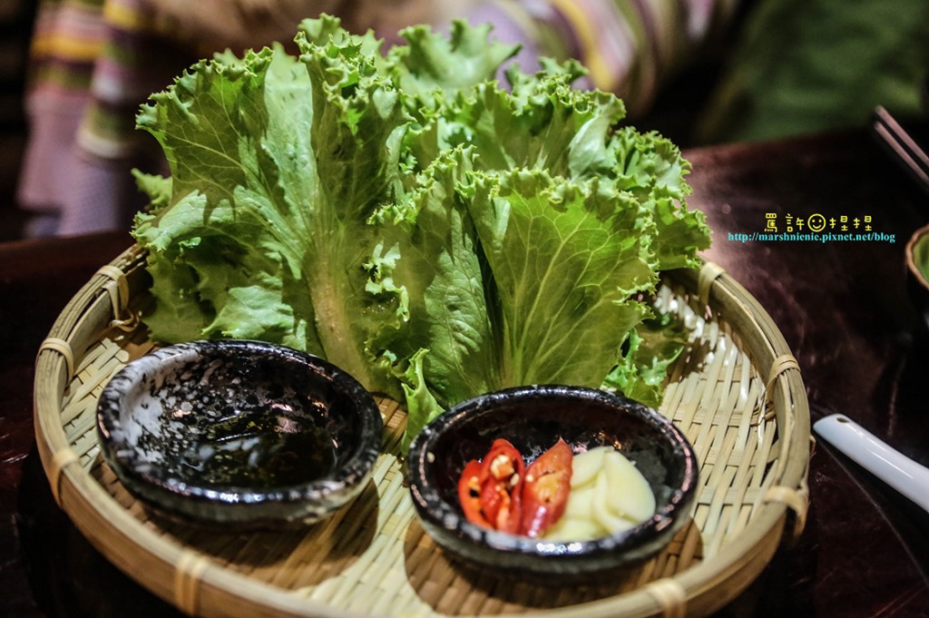 它的吃法是將燒肉放在生菜上,然後在鋪上一些蒜片和辣椒,用生菜包著一起吃,