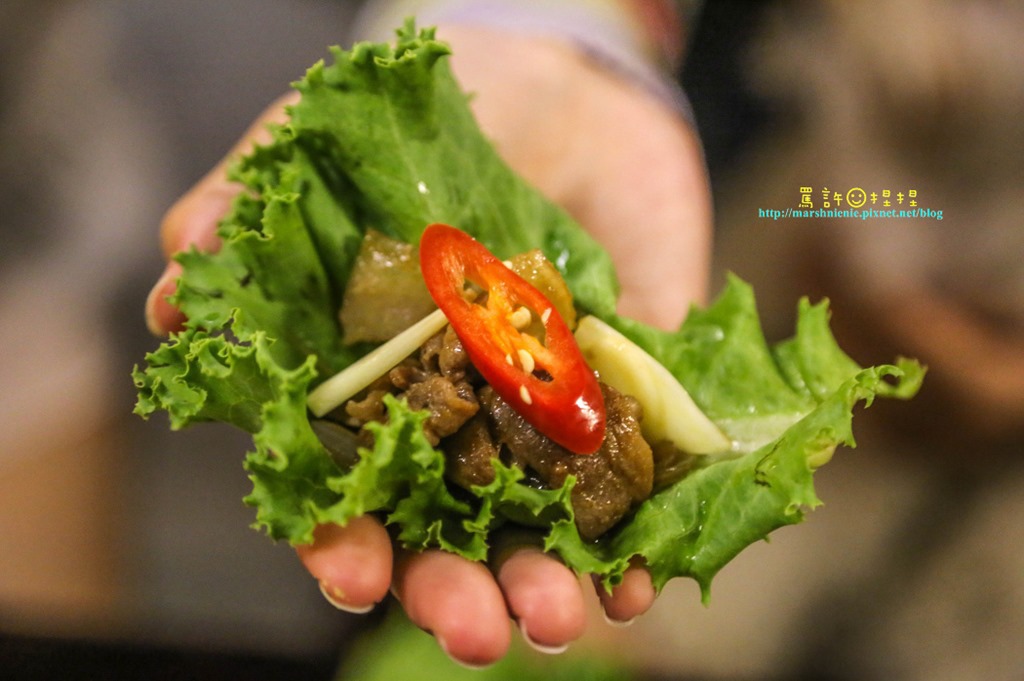 ▼將這些食材用生菜包起來後一口放進嘴裡