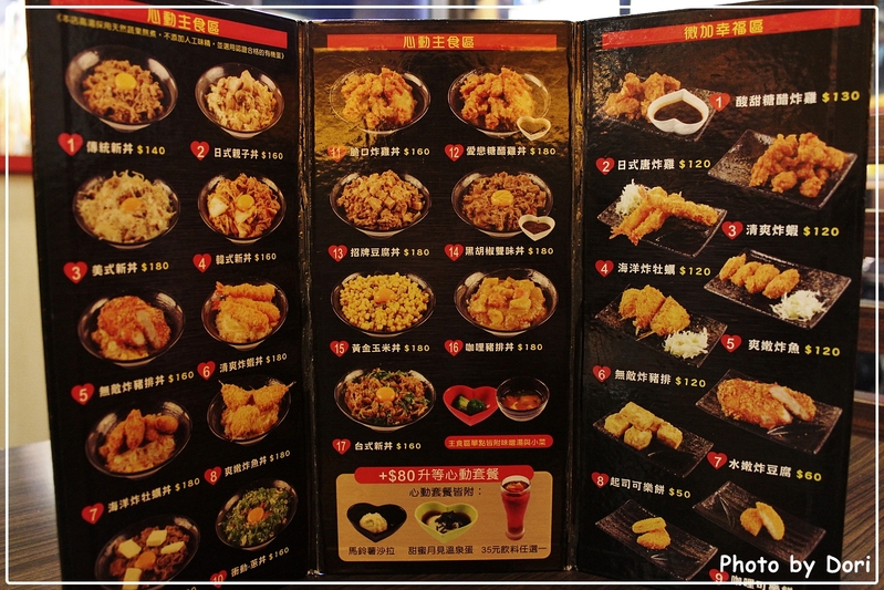 多種口味的創意丼飯的選擇讓人有點難以招架,單點丼飯皆附小菜及味增湯,加價NT80元就能升等為套餐,多了馬鈴薯沙拉、溫泉蛋及飲料。另外還有所謂的微加幸福炸物區。