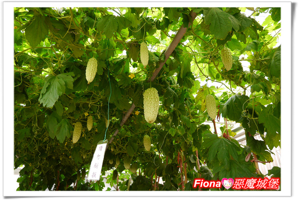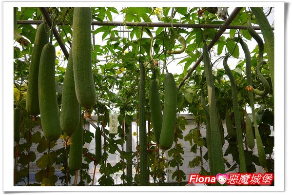 頭頂上有許多絲瓜,看起來好像差不多,但是品種都不太一樣,圓圓筒狀樣的叫做圓筒絲瓜,有些長度長到讓人傻眼的稱為長形蛇瓜,看起來是不是真的很像一條蛇呢??
