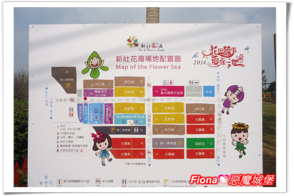 在進入「新社花海」會場前,先來看看花海場地配置圖,今年以辦喜事的心情來設計花海,取名「花田喜事 愛你一世」,共設有7個主題展館,加上精心設計的「台中國際花毯節」,很令人期待呢!!