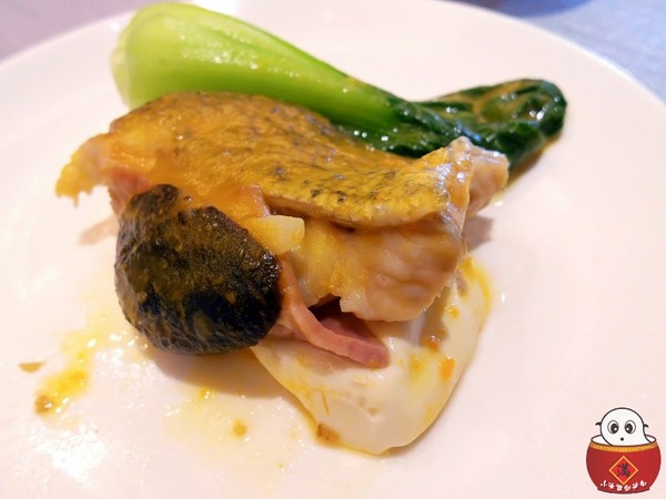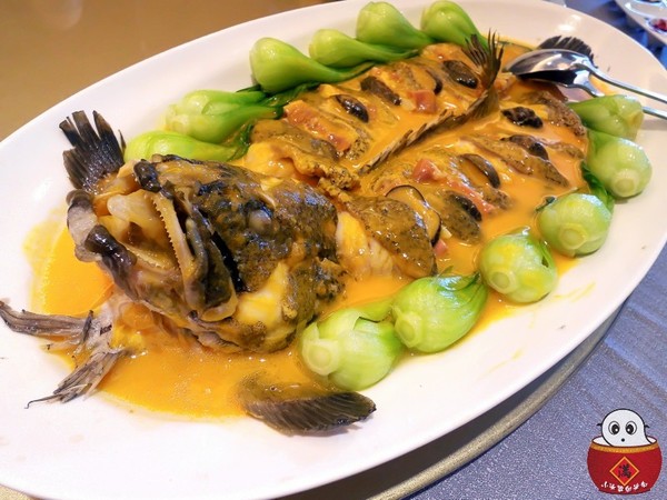 石斑魚下面有墊著豆腐,一旁還有臘肉跟香菇提味,清江菜增色,最後在淋上南瓜醬