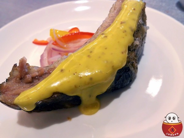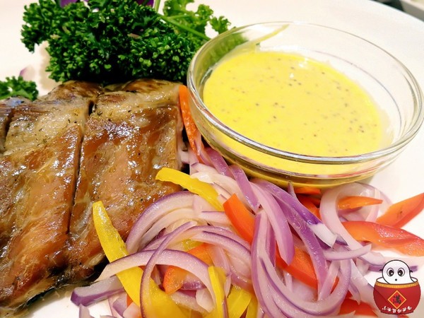 就切了一塊的豬肋排下來,順便淋上酸香的芥末美乃滋