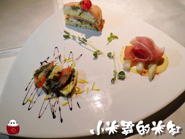 白蘆筍襯風乾火腿&牛蕃茄起司佐青醬&煙燻鮭魚蛋糕