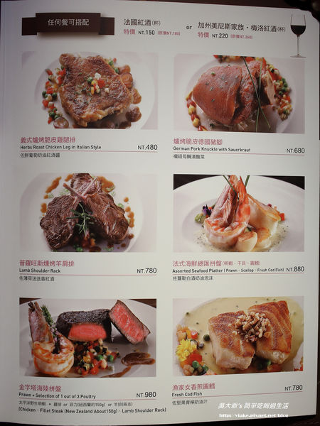 ↑選一個主餐+250元,可享用開胃菜、麵包、湯、沙拉、甜點、飲料