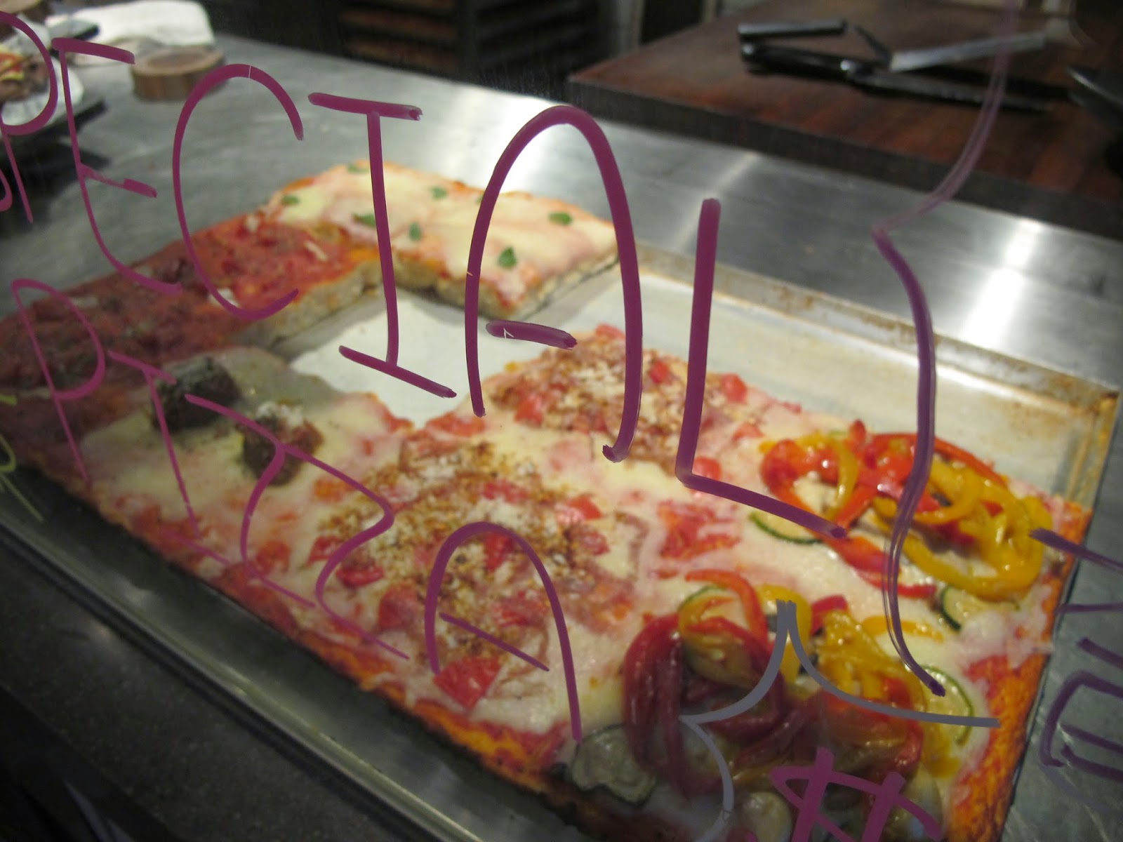 吃過他的披薩與義大利麵後,就常常光顧這間店,雖然是街頭小吃的菜色,但卻因為他的食材用得很好,一入口你就知道這是好質感的美食! 連最簡單的蔬菜披薩都可以那麼好吃,披薩是事先切大塊做好放在檯面上,跟義大利的小館一樣的作法,等你挑選好口味後,店員立刻將披薩放入烤箱中加熱,並對切四片後,送上桌! 披薩麵皮吃起來酥脆,但麵餅中間又厚又有彈性,完全是內軟外脆的口感,和義大利當地的披薩比較起來,較不油膩,而且比較軟Q,非常符合台灣人喜歡的口感,披薩有各式各樣的口味,從火腿蘑菇、義式肉丸、沙拉米、甜椒等,應有盡有,每種都好想吃啊! 我每次來都會試試不同的口味,每次都沒讓我失望。