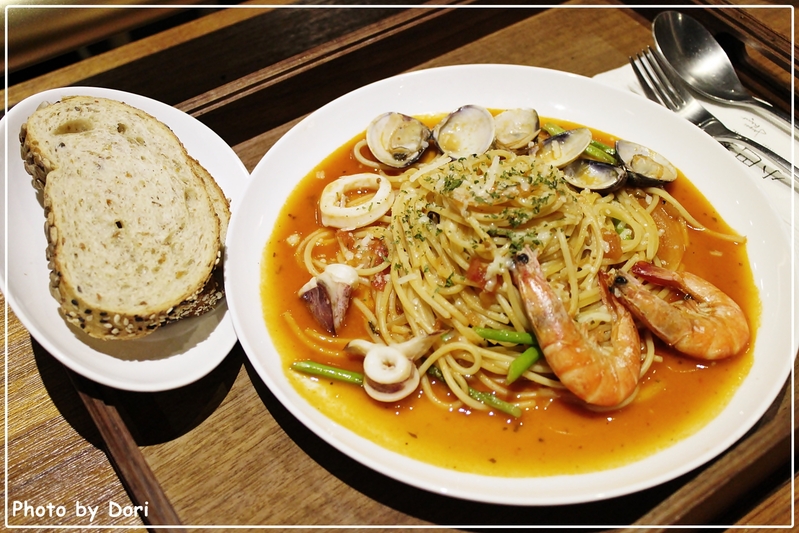 這算是主餐之一,內有蛤蠣、墨魚、蝦子和蘆筍,以義大利麵的份量來說不是問題,但是配料上可能會讓人感覺少了一點。附餐有麵包及白飯可選擇,來到這裡當然就是要欽點麵包啊~