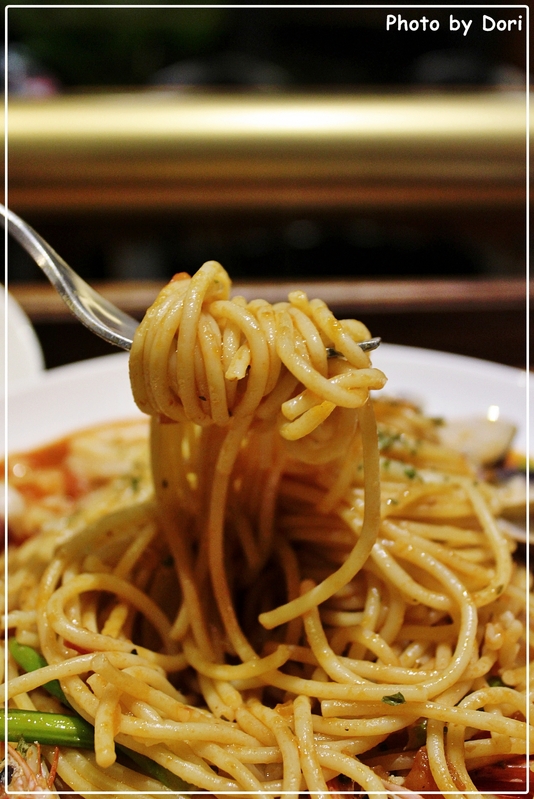 沾附番茄湯汁的義大利麵條,熱騰騰的直想讓人捲起食用,莫約吃一半左右就開始有了些微的飽足感。